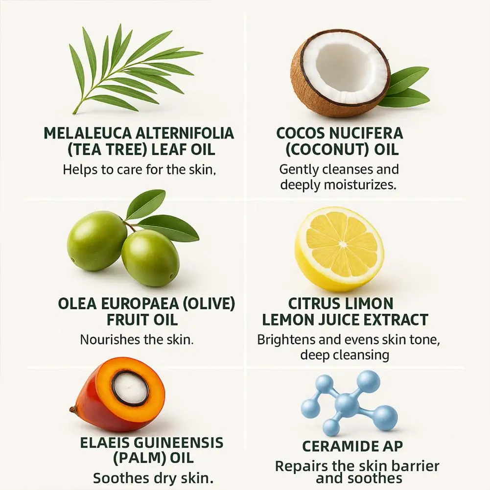 1.Takes tea tree oil as a core ingredient, combined with mild soap base, realizing gentle cleansing without irritating the skin