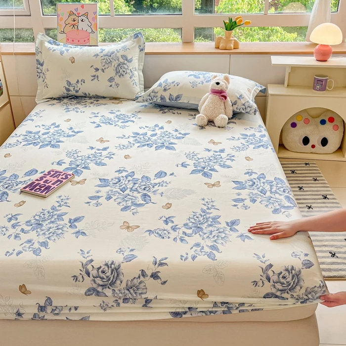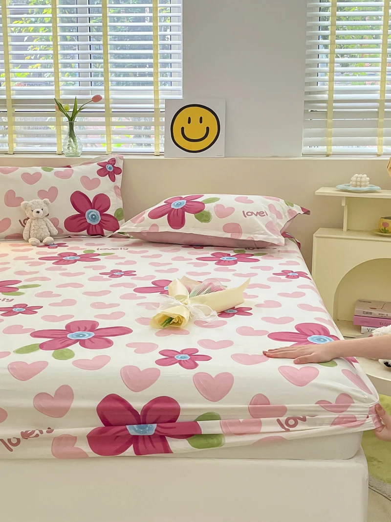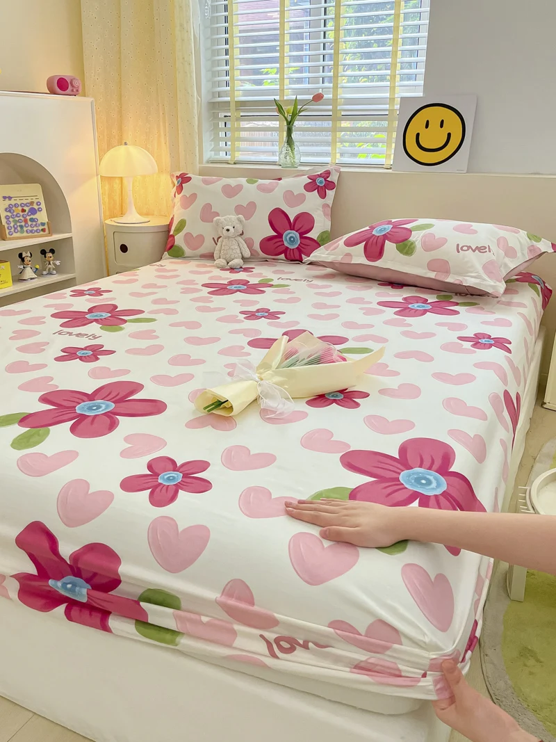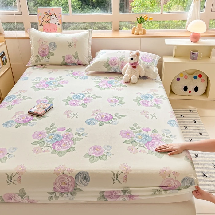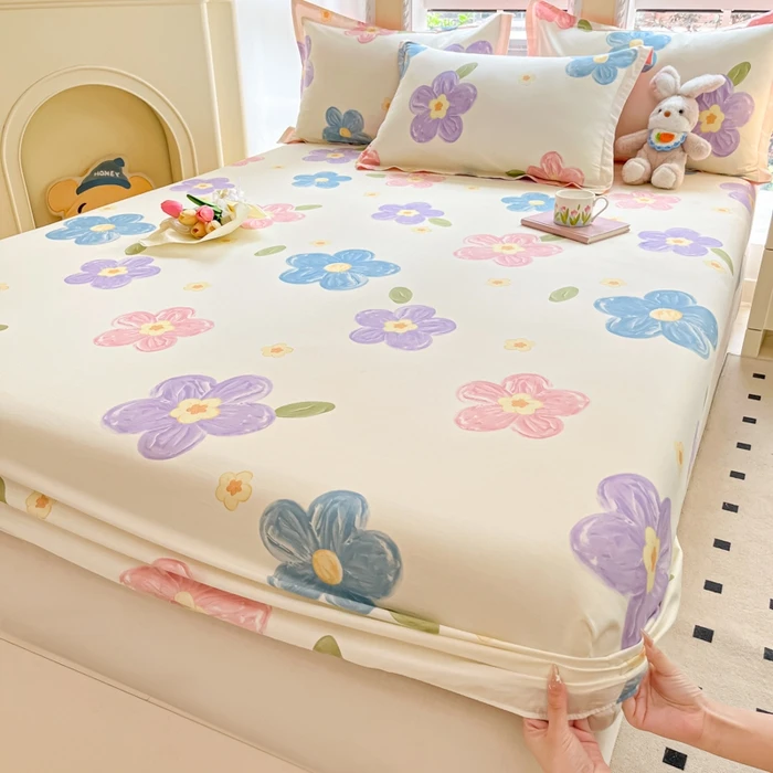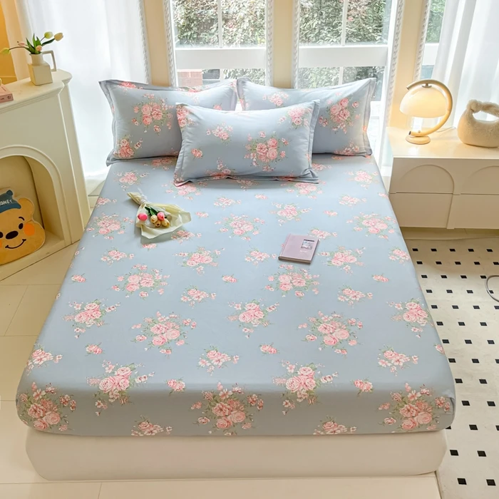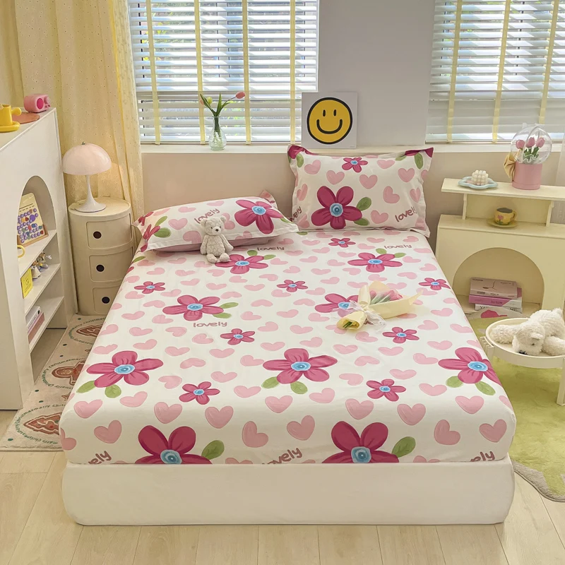 100%Pure Cotton Fitted Bed Sheet Sets with Pillowcase Flower Printing Bed Cover Single/Queen/King Size fundas de colchón Sheets
