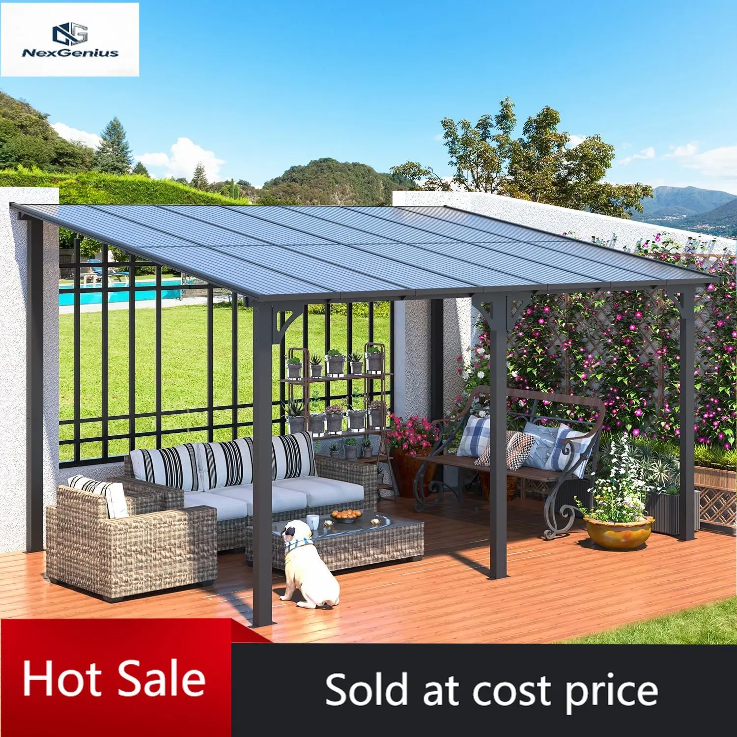 • Comprehensive Protection: The awning roof on top of the pergola provides protection from UV rays and rainwater, covering an area of 140 Sq.Ft.