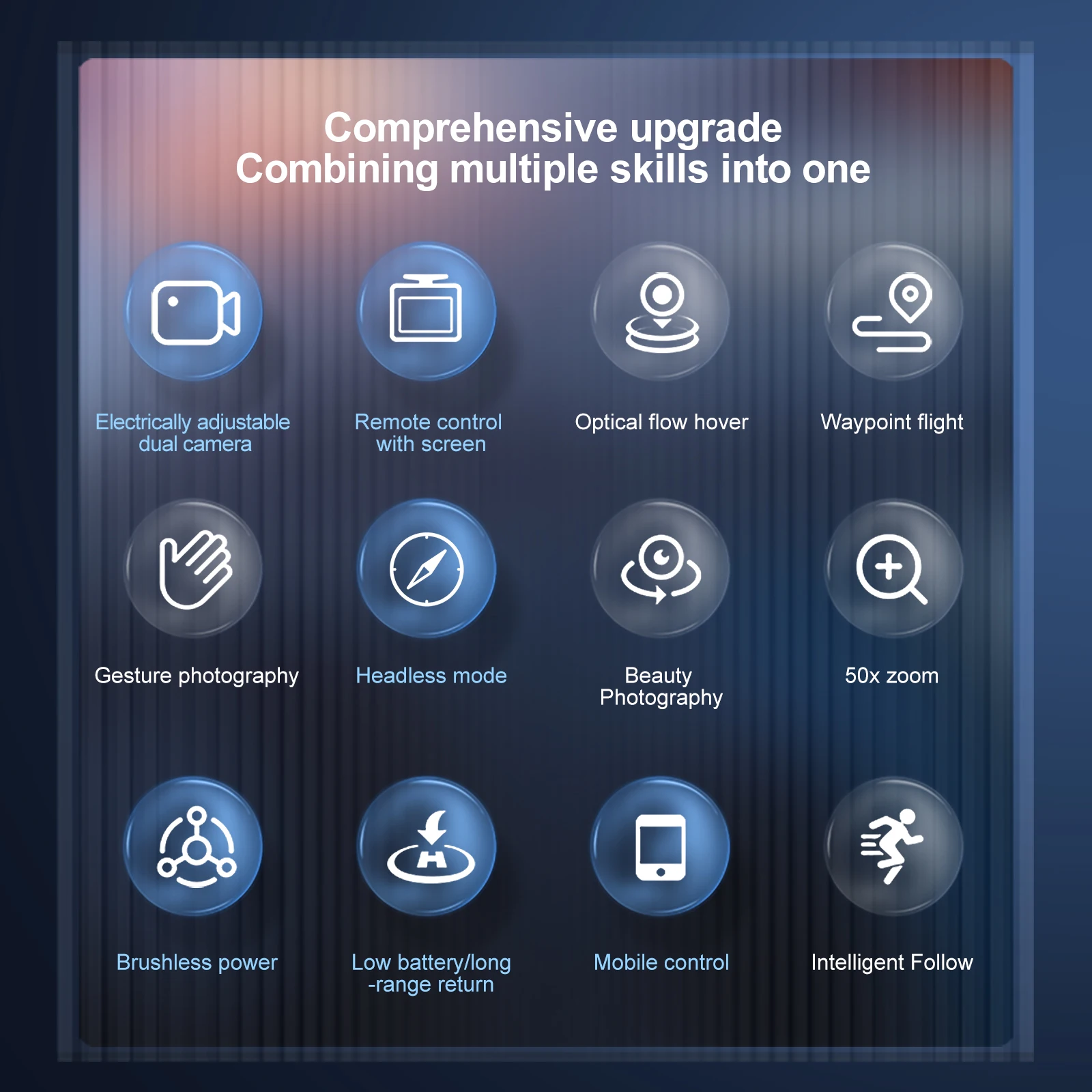 4. Connect WIFI system functions: photo, video and real-time transmission, emergency stop, trajectory flight, one button around, intelligent follow, add music, picture rotation