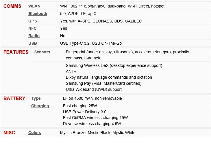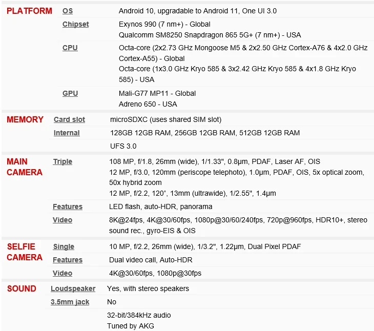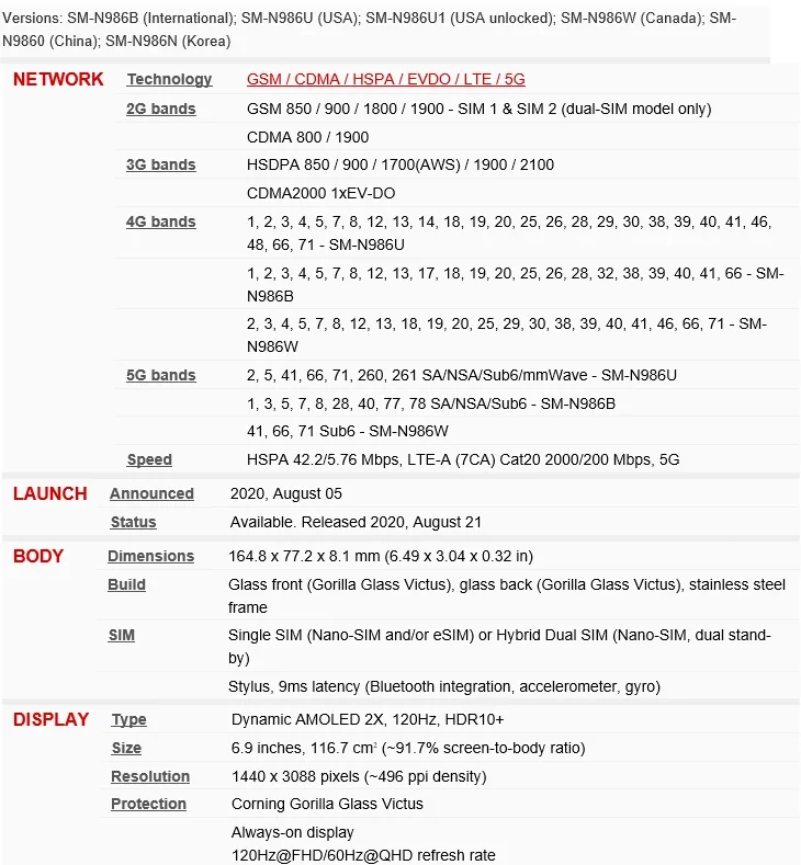 Samsung Galaxy Note 20 Ultra 5Gspecifications
