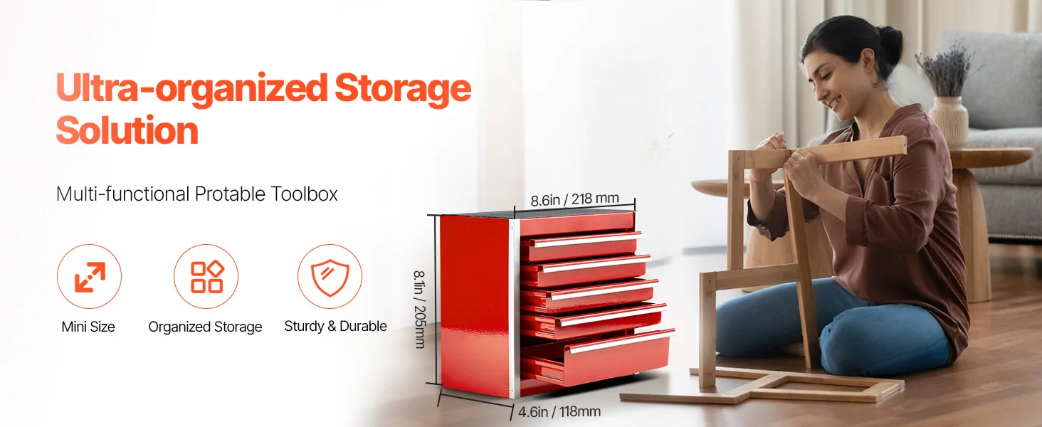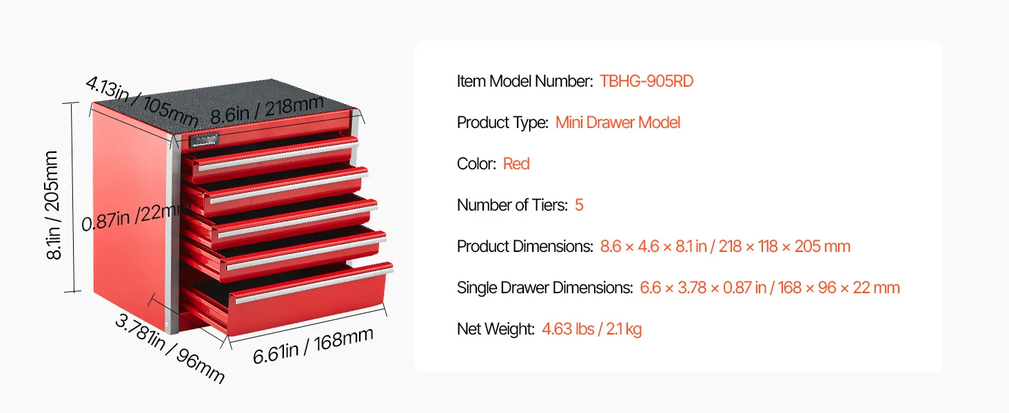 Mini Metal Toolbox: The steel tool box measures 8.6 x 4.6 x 8.1 inches and weighs just 4.63 lbs, making it an ideal fit for your desk. It’s an excellent helper for organizing various small items. Inside, it features 5 drawers (dimensions: 168 x 96 x 22 mm) with a 2.2 lbs weight capacity per layer, providing flexible storage for all your smaller belongings.
